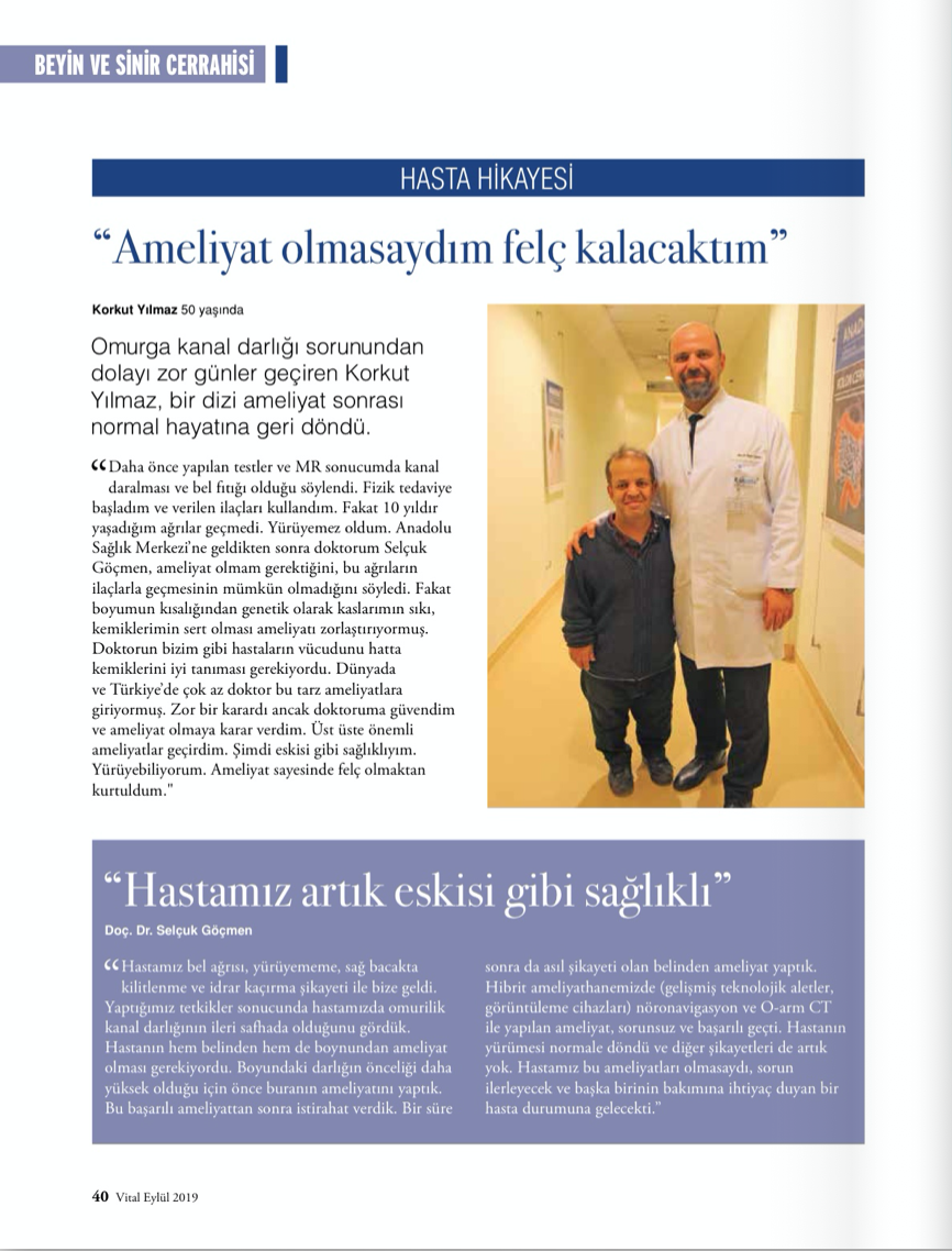 Selçuk Göçmen, hastanın bel ağrısı, yürüyememe, sağ bacakta kilitlenme ve idrar kaçırma şikayetleriyle başvurduğunu belirtti. Yapılan tetkikler sonucunda omurilik kanal darlığının ileri safhada olduğu tespit edildi.