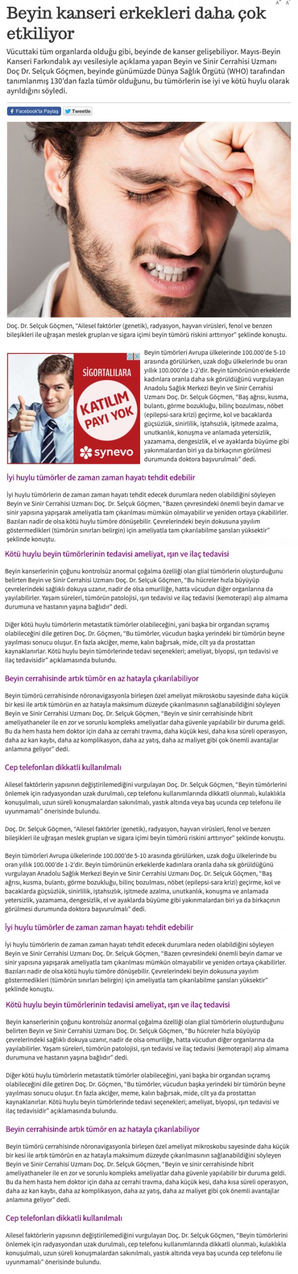 Beyin tümörlerinin Avrupa ülkelerinde yıllık 100.000 kişide 5–10 arasında görüldüğü, uzak doğu ülkelerinde ise bu oranın 100.000 kişide 1–2 civarında olduğu ifade edildi. Erkeklerde kadınlara oranla daha sık görüldüğü belirtilen beyin tümörlerinde; baş ağrısı, kusma, bulantı, görme bozukluğu, bilinç bozukluğu, nöbet geçirme, kol ve bacaklarda güçsüzlük, sinirlilik, iştahsızlık, dikkat azalması, unutkanlık, konuşma ve anlama güçlüğü, yazamama, dengesizlik ve el-ayaklarda büyüme gibi yakınmaların bir ya da birkaçının görülmesi durumunda doktora başvurulması gerektiği vurgulandı.