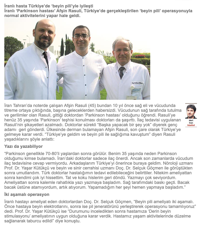 Yaklaşık 10 yıl önce sağ elinde ve vücudunun sağ tarafında titreme, tutulma ve gerilmeler başlayan A.R., yapılan değerlendirmeler sonucunda Parkinson hastası olduğunu öğrendi. Genç yaşta konulan bu tanı sonrası uzun süre ilaç tedavisi uygulandı ancak şikâyetlerinde belirgin bir azalma olmadı. Doktorların başka bir tedavi seçeneği bulunmadığını söylemesi üzerine A.R., son çare olarak farklı bir ülkede tedavi arayışına girdi.