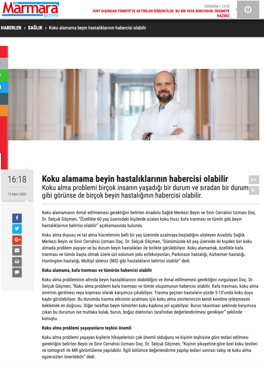 Beyin ve Sinir Cerrahisi Uzmanı Selçuk Göçmen, özellikle ileri yaşlarda ortaya çıkan koku alma azalmasının, kafa travması ve tümör gibi beyin hastalıklarının belirtisi olabileceğini belirtiyor. Koku ve tat alma hücrelerinin belirli bir yaştan sonra azalmaya başladığını ifade eden Göçmen, günümüzde 60 yaş üzerindeki birçok kişide koku alma probleminin görülebildiğini ve bu durumun beyin hastalıklarıyla birlikte ortaya çıkabileceğini söyledi.