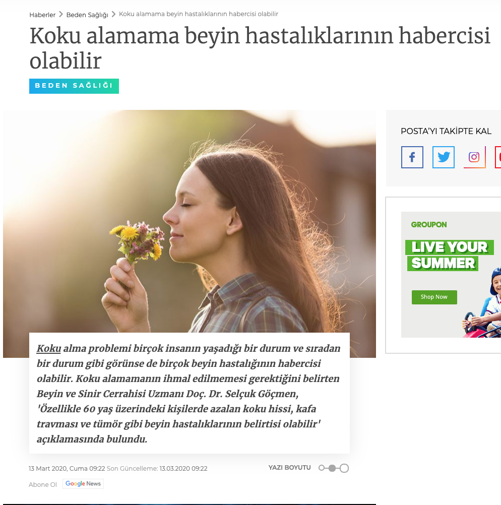 Beyin ve Sinir Cerrahisi Uzmanı Selçuk Göçmen, özellikle 60 yaş üzerindeki kişilerde azalan koku hissinin kafa travması ve tümör gibi beyin hastalıklarının belirtisi olabileceğini ifade ediyor.